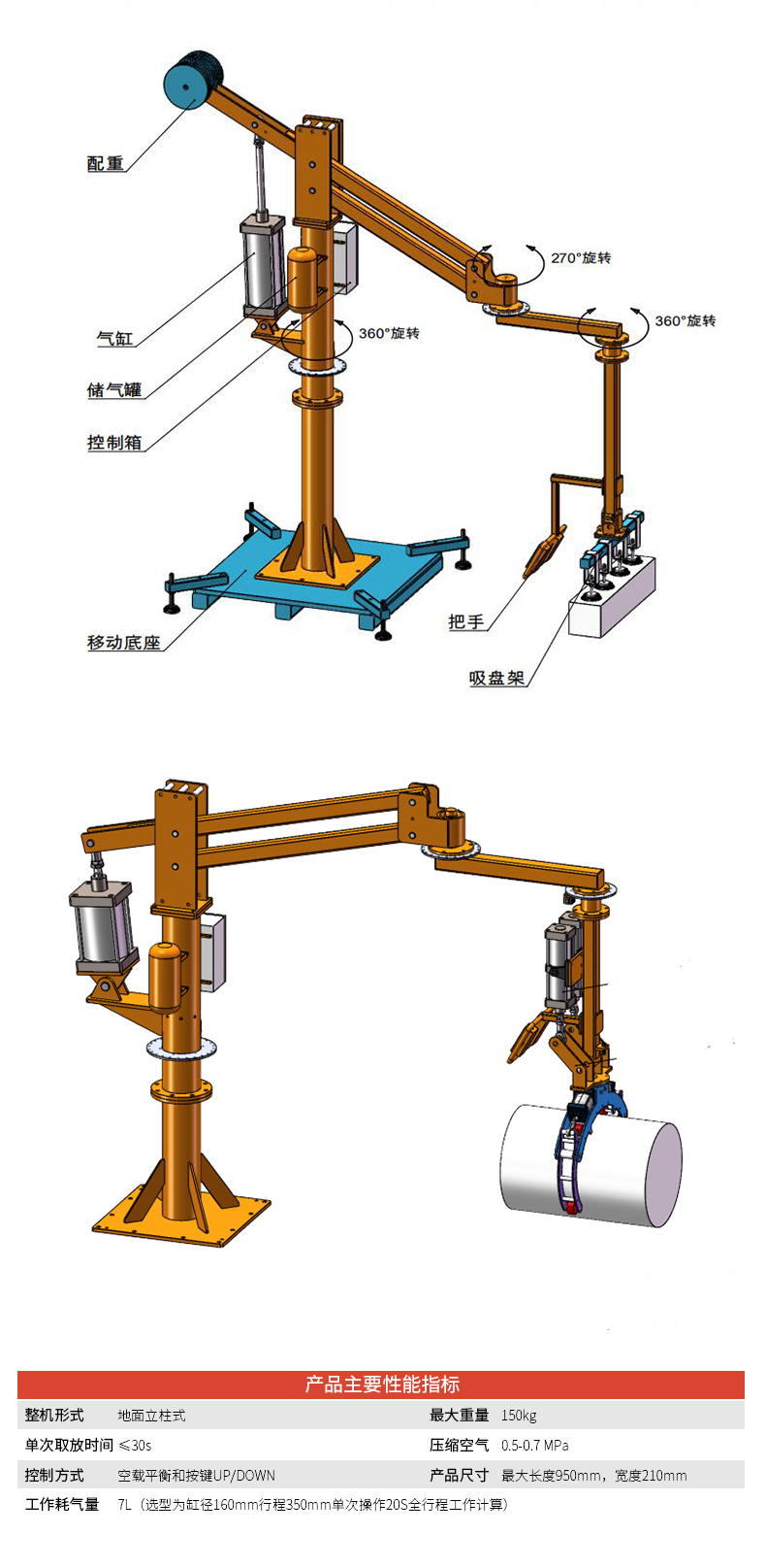 助力機械手描述:助力臂主體配有儲氣罐,可在斷氣情況下繼續使用一個循環,防止工件下降。并設有安全系統,安全上采用雙放措施,非沒有放置到安全位置不能釋放。操作控制方式采用空載平衡和按鍵UP/DOWN。